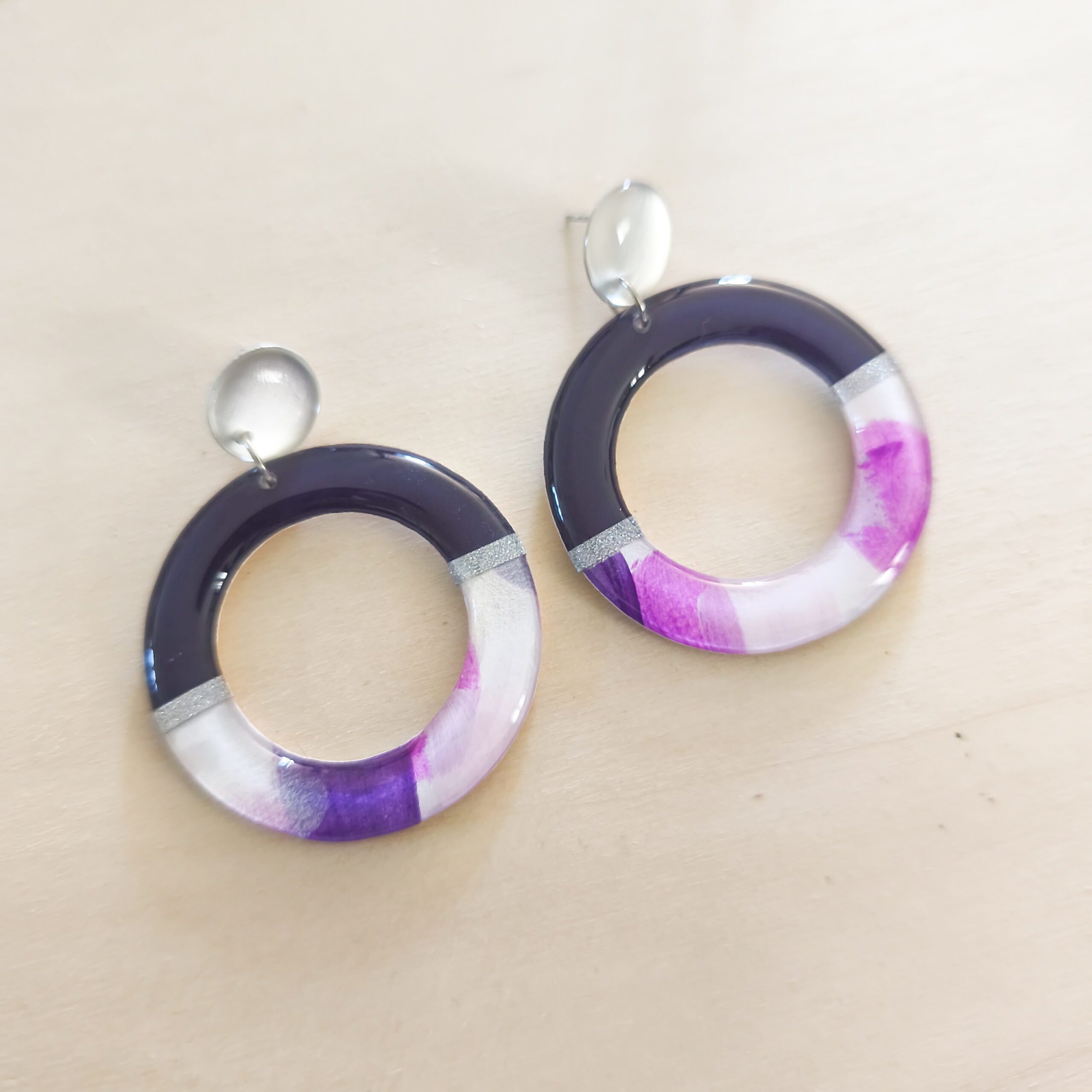Boucles d’oreilles peintes et fabriquées à la main, composées d’une pastille de papier résiné ajourée et montée sur une attache clous acier inoxydable ornée d’une puce de résine.