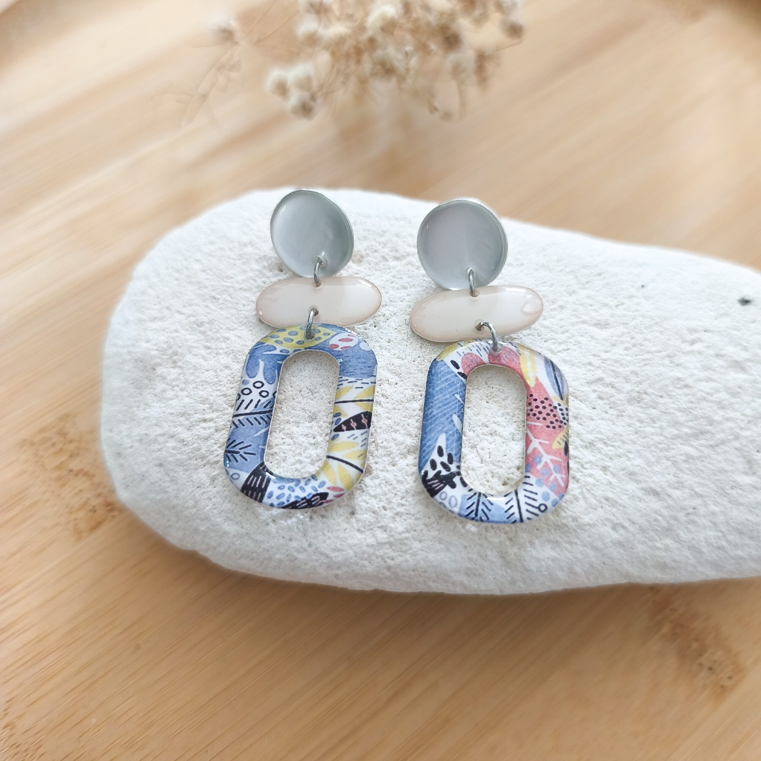 Boucles d’oreilles fabriquées à la main. Chaque boucle est composée d’une puce et d’un pendentif en papier résiné. La boucle est montée sur une attache clou acier inoxydable.