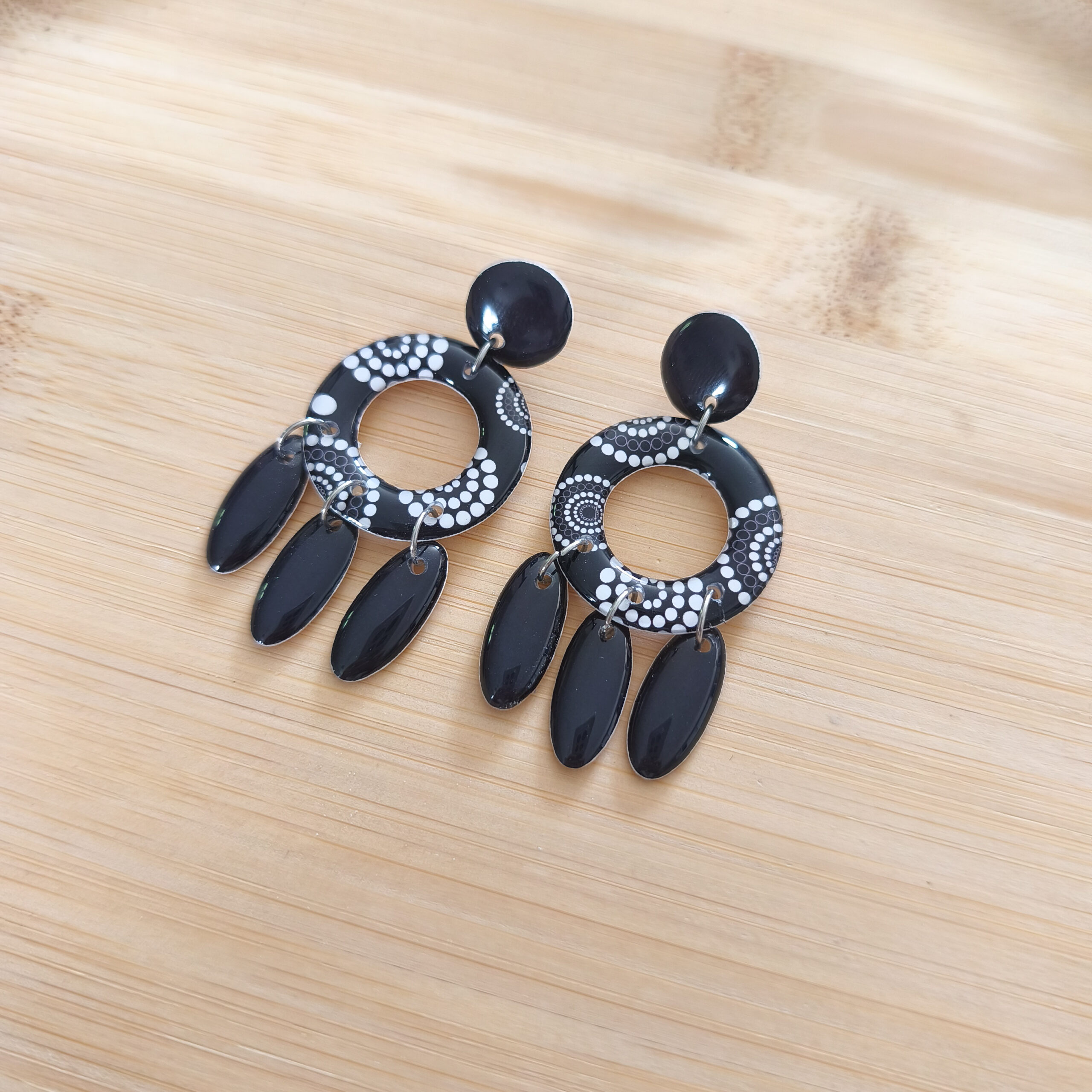 Boucles d’oreilles fabriquées à la main. Chaque boucle est composée d’une puce et d’un pendentif en papier résiné avec ses 3 petites breloques. La boucle est montée sur une attache clou acier inoxydable.