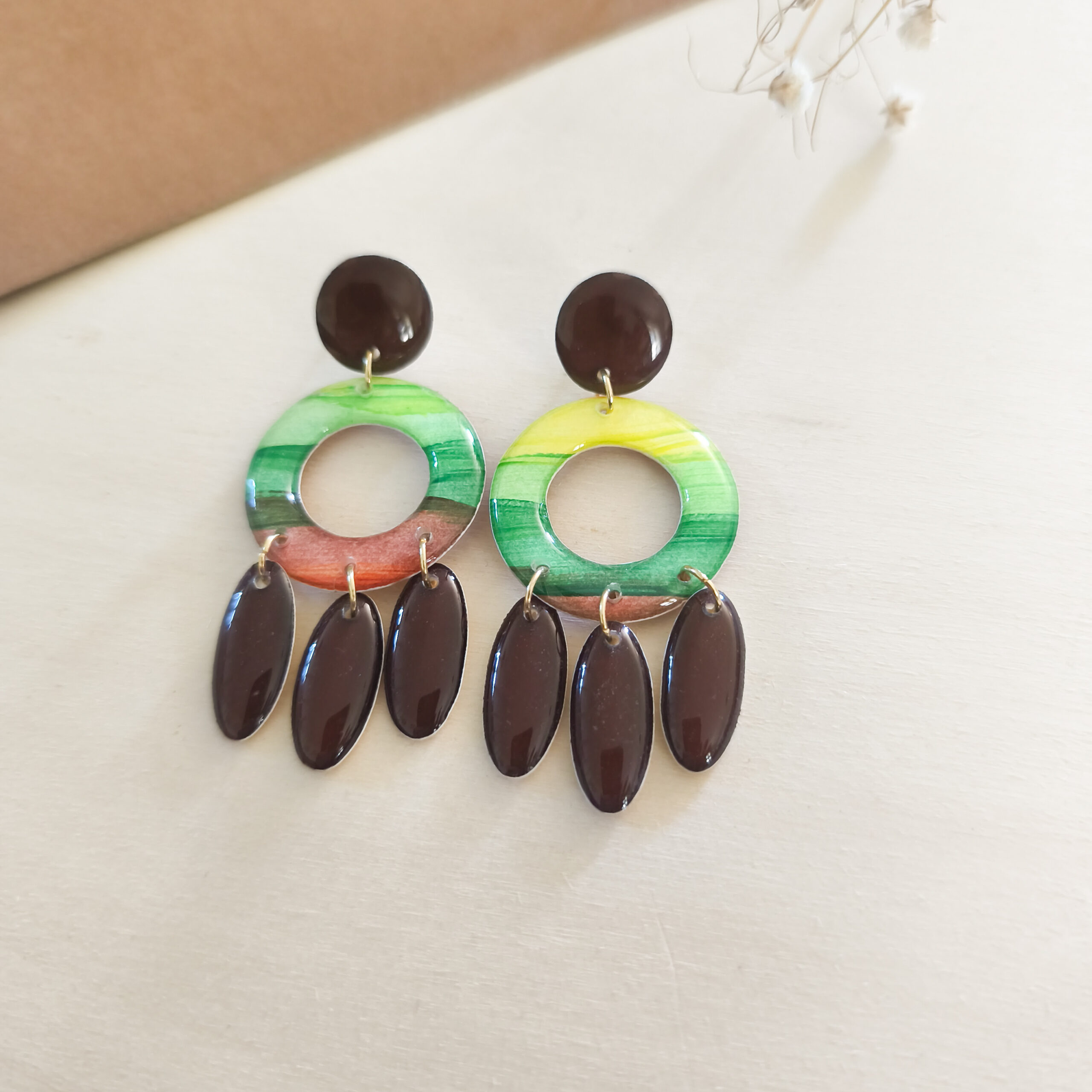 Boucles d’oreilles fabriquées à la main. Chaque boucle est composée d’une puce et d’un pendentif en papier résiné avec ses 3 petites breloques. La boucle est montée sur une attache clou acier inoxydable.